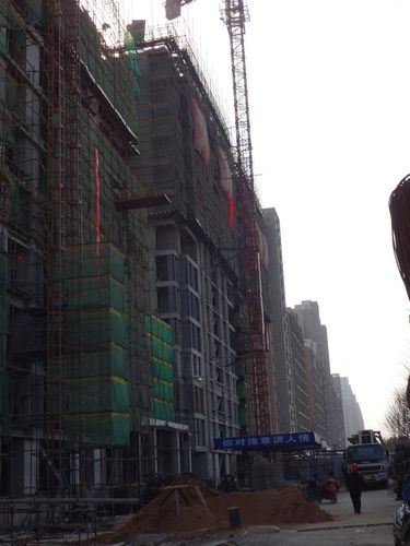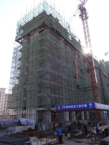 3、万象蓝天1#楼15层钢筋绑扎,脚手架搭设。